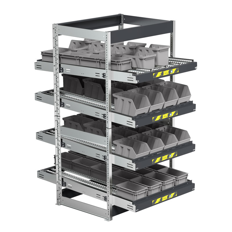 The process of loading the material onto the various inclined frames is from behind and follows the FIFO (First In, First Out) principle of Lean Production: the first elements stored will be the first to be used, ensuring the removal of the oldest components and preventing them from remaining in stock too long.