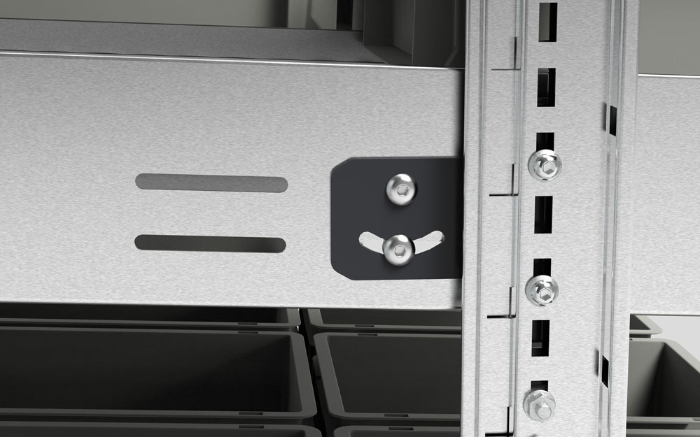 Kanban roller shelving units can be customised down to the smallest detail in terms of inclination and number of frames, quantity of rails and distance between the rollers of each rail. Each element of the gravity roller shelving unit must be adjusted and set according to the weight and type of box or bin to be stored to ensure a controlled descent of the work kits and avoid falls or possible damage to the material.