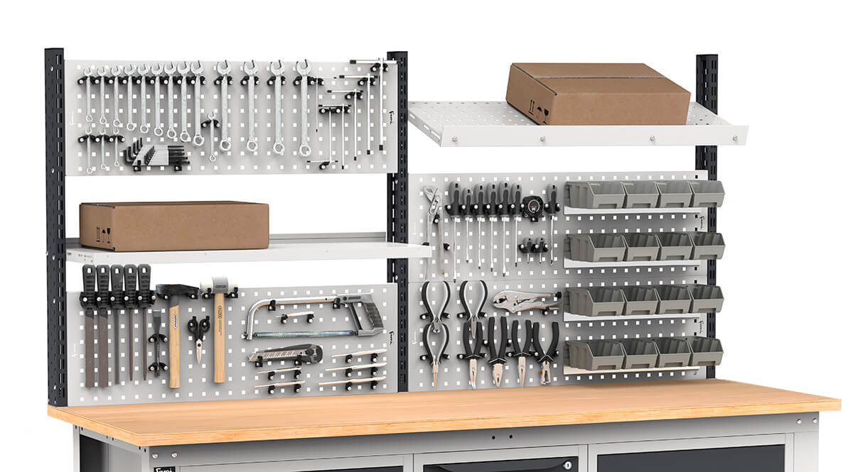 Cualquier modelo de banco de trabajo con ruedas se puede equipar con un panel perforado que permite organizar equipos, herramientas y componentes. Los paneles de orificio cuadrado pueden alojar ganchos y accesorios Iron Team, garantizando un almacenamiento seguro durante el desplazamiento del banco.