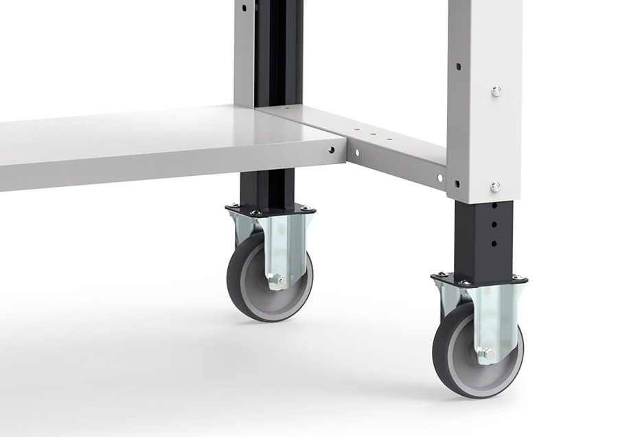 Es posible elegir entre ruedas de diferentes materiales para instalar las más adecuadas tanto en términos de capacidad de carga deseada como en función del ambiente en el que se utilizará el banco de trabajo móvil.