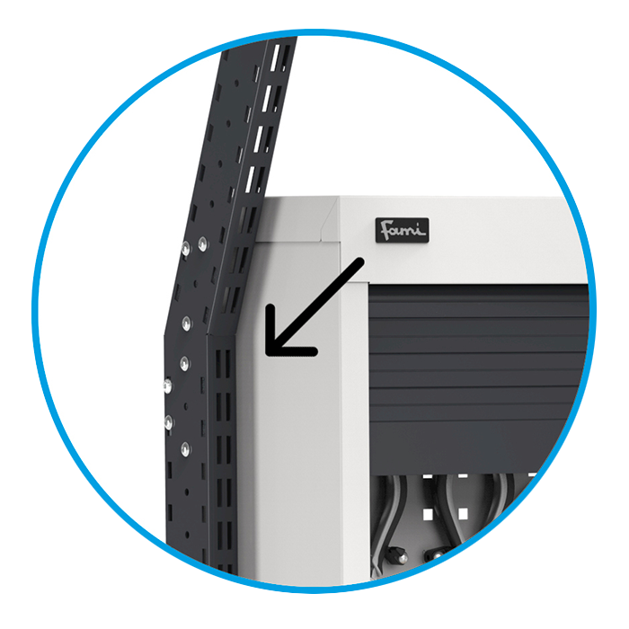 Gli armadi a tapparella possono essere integrati in banchi da lavoro o fissati direttamente a muro per disporre di un ulteriore spazio in cui stoccare utensili e attrezzi da lavoro grazie al pannello forato portautensili posteriore.