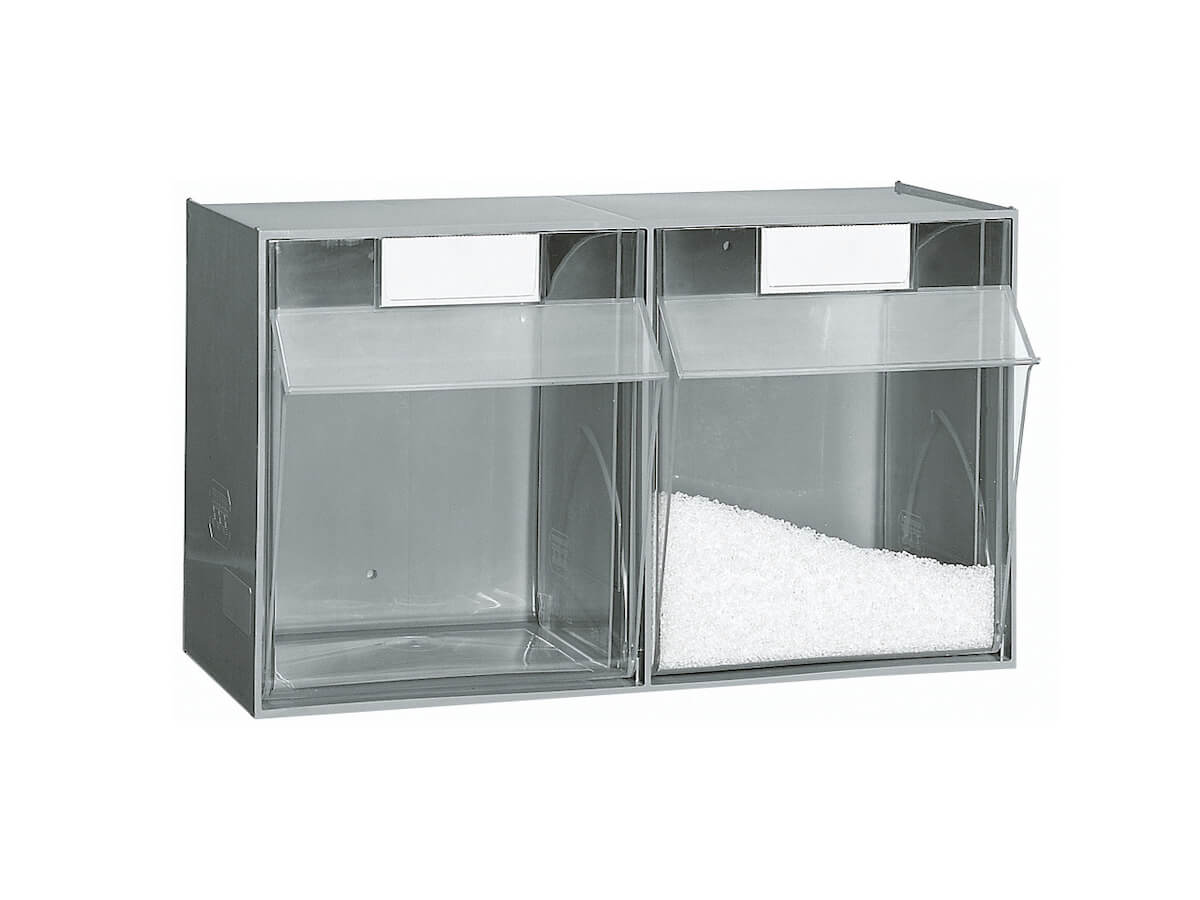 Szuflady z przezroczystego polistyrenu o dużej wytrzymałości mechanicznej umieszczone są w odpowiednim pojemniku, przygotowanym do ustawienia w regałach i wózkach z serii Visual Box lub mocowania do ściany za pomocą kołków.